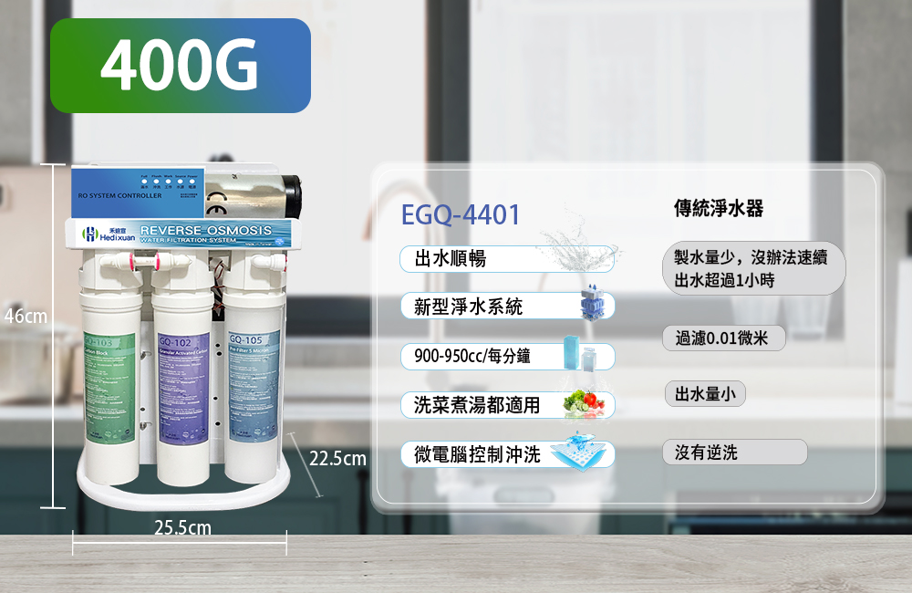 ◎型號:EGQ-4401 活性碳純水機型◎產地:台灣製造生產◎規格:400加侖膜片;◎電壓:110V / 60Hz;◎進水壓力:10PSI~15PSI;◎進水溫度:5~38°C;◎重量:8.5公斤[淨重];◎零件:濾膜材料NSF、台製金屬白色烤漆架、台製高低壓控制開關、台製濾殼、低噪音出水馬達、進口的韓國品牌水管;◎尺寸:(W;D;H) 寬度25.5公分 深度22.5公分 高度46公分◎出廠品牌:禾迪宣——————————濾心及更換時間說明: (具體還視水質而定)第一道: GQ-105 初過濾(5 / 1微米) 3~4個月 (纖維濾芯:深層過濾水中雜質、泥沙頭髮肉眼可見物質)【濾心原料通過美國NSF-42】第二道: GQ-102 GAC 顆粒活性碳 (4~6個月)個月(去除水中異味、氯)【濾心原料通過美國NSF-42】第三道: GQ-103 CTO 塊狀活性碳 (4~6個月)(去除水中的汙染物、氯、化學物質、農藥殘留物等)第四道: 400加侖 大流量逆滲透膜(18~24個月)(濃縮和分離水中之大分子微粒、有機物、殘留細菌、藻類)第五道: 日碳 NSF活性碳(12個月) (吸附水中的異色、異味,調整純水口感,確保水純淨甘甜可口,增進口感)搭配加熱器龍頭主機 寬度至少需要 49 公分關於安裝: